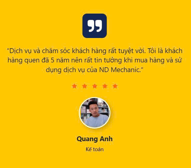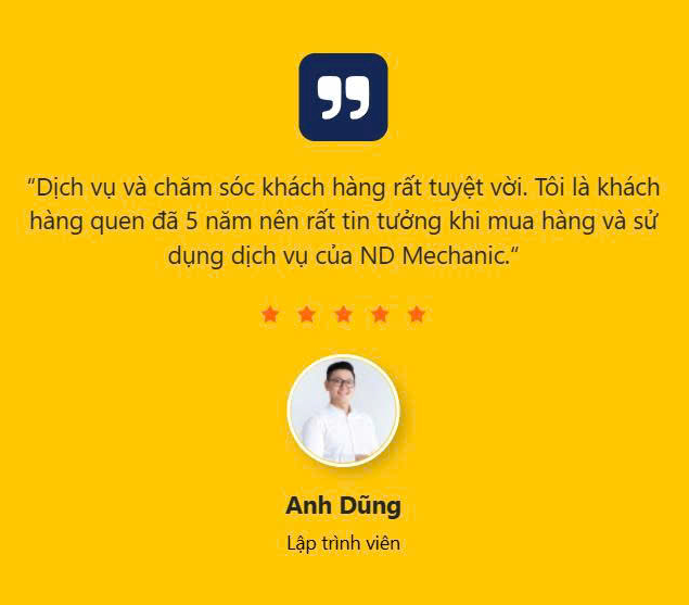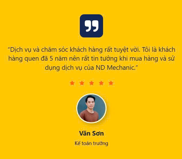 | | Khách hàng nói gì về ND Mechanic Đánh giá của khách hàng là cơ hội của chúng tôi để cải thiện, nâng cao chất lượng dịch vụ ngày một tốt hơn !